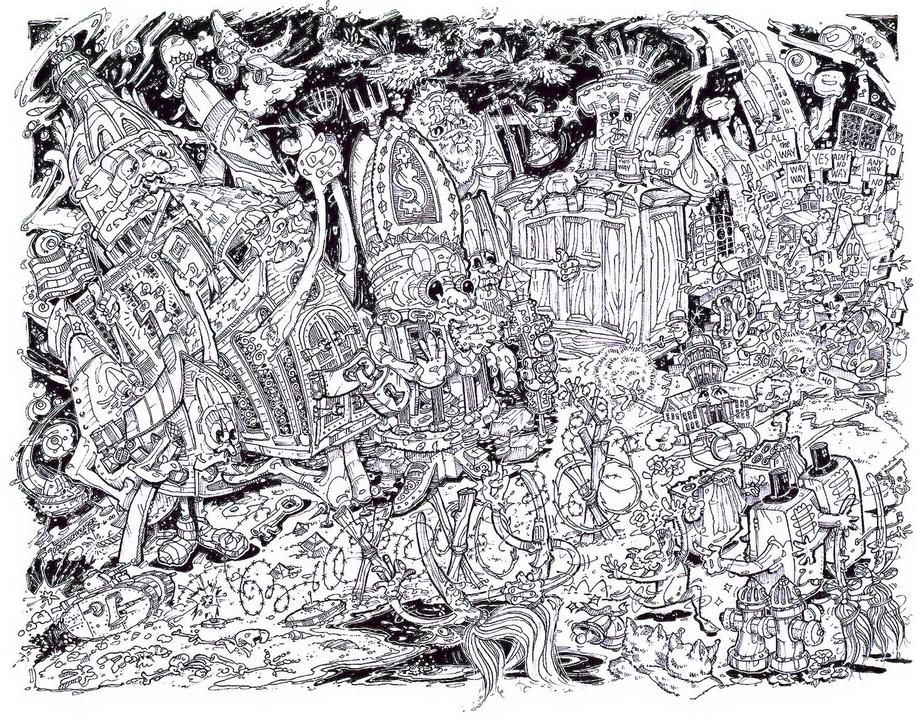 This drawing was conceived on the eve of the millennium and reflects the general hysteria circling the globe at the time. Everything from the end of civilization to the complete meltdown of all the computers which had not been programed to compensate for the change to a new century. Mayhem ensued and then; the sun came out and nothing happened. Who could have guessed?
